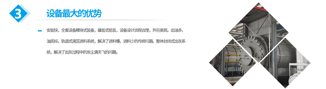 公司生產的設備的優勢:安裝快,全套設備模塊式裝備,撬裝式組裝,設備設計流程合理,外形美觀,出油多,油質好。軌道式液壓進料系統,解決了進料慢,進料少的傳統問題。整體封閉式出灰系統,解決了出灰過程中的灰塵滿天飛的問題。